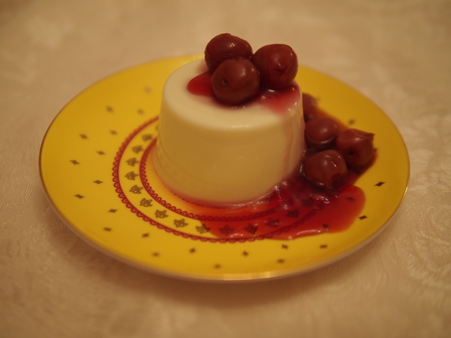 7. Lay cherries out on top of each Panna Cotta serving and pour the compote mixture over. Put back into refrigerator until the serving time.