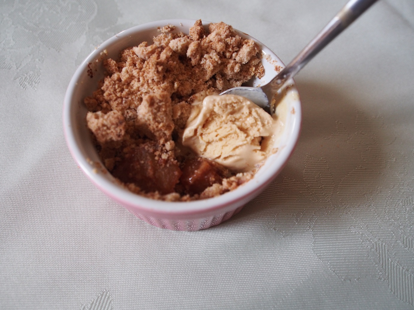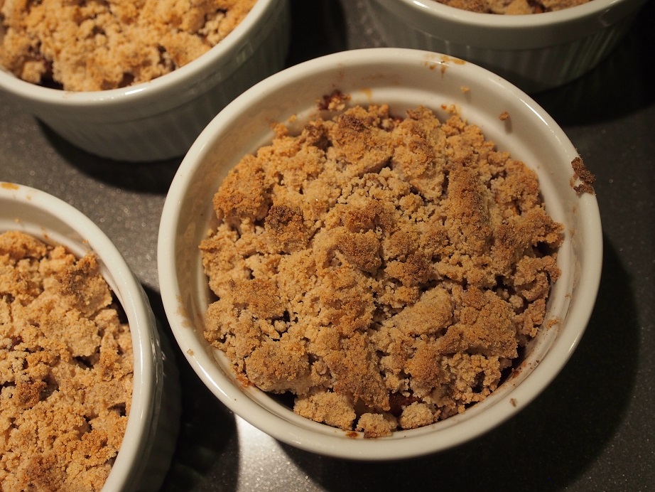 6. Use the above technique to transfer Crumble pieces to cover the apples. Bake in the oven with no fan for 25 minutes for ramekins or 30 minutes for a single baking form, or until the Crumble starts to brown.