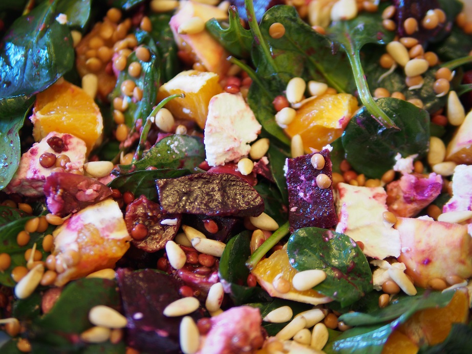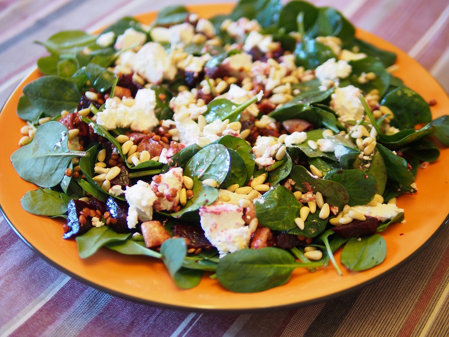 5. Evenly distribute the dressing with oranges and beets over the spinach and toss very lightly. Sprinkle with pine nuts or pumpkin seeds before serving.