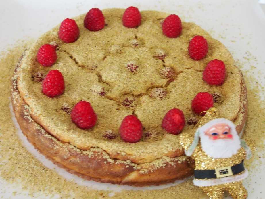8. When the cake is ready, let it cool in the tin. Then remove and when completely cooled dust with saved pistachio flour and decorate with raspberries. To finish off with decorations, use icing sugar if desired.