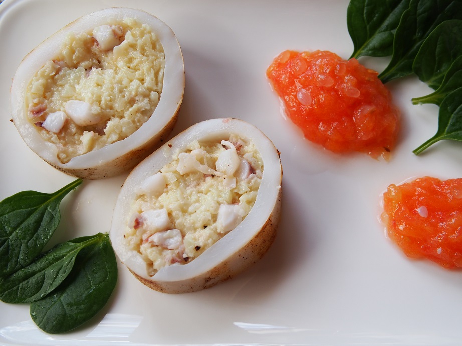 b. Cut calamari in half and grill each side for 1 minute and dice them. Warm up the risotto in the wok over the medium heat, switch off the heat and mix the calamari into the cauliflower risotto. Use salt and pepper if needed. Serve with the chutney.