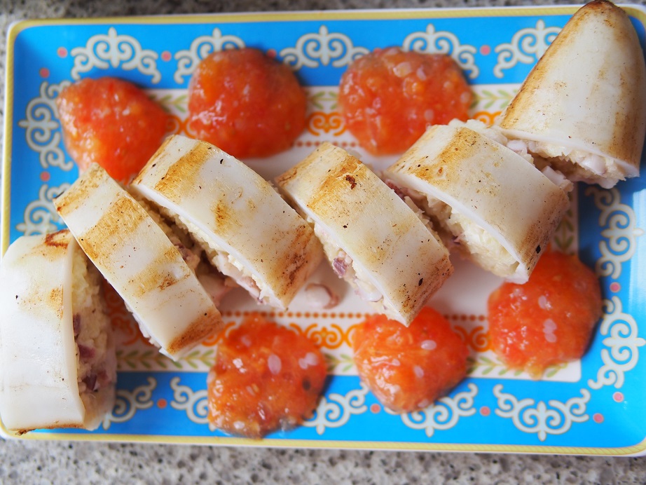 Grill or bbq the whole stuffed calamari constantly turning it, for 2-3 minutes on high. Use salt and pepper once done. Slice into portions and serve with the chutney.