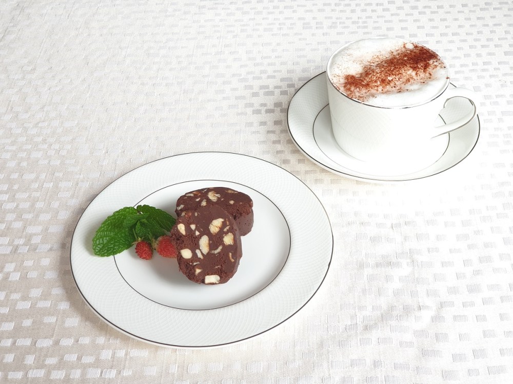 3. Transfer the mixture onto the aluminium or silicone sheet. Pull one side of the sheet over the chocolate mixture and roll with your palms to form a log about 30cm/1ft long and 5cm/2in in diameter. Wrap the log using the same sheet and put it into a fridge to harden. Leave at the room temperature for 15 minutes before you are ready to cut the log into 1.5 cm pieces to serve. It will be less crumbly.