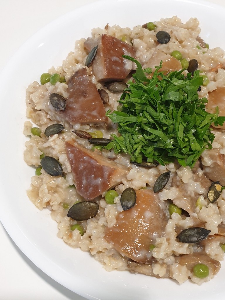 - Use the last cup of stock and the mushrooms and mix well. When all the liquid is fully absorbed, mix in the milk and let it just to start simmering. Serve with finely chopped parsley and pumpkin seeds on top. Asparagus can be also finely cut and mixed in along with the parsley.