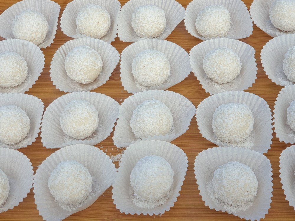 4. Wash your hands but do not dry. Use the measuring tablespoon, fill it with the mixture, remove the excess, take it out into your palms and roll the ball. Then using one palm, roll the coconut ball in the desiccated coconut on the baking paper and place it into the individual paper cup. Repeat until all the mixture is used and 24 balls are made.