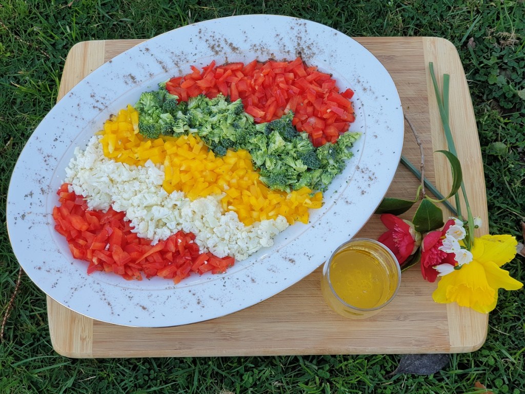 Spending this spring in lockdown meant to have more time spending in nature. Colours of spring inspired me for this salad. Please notice matching colours with the flowers from my garden 🙂