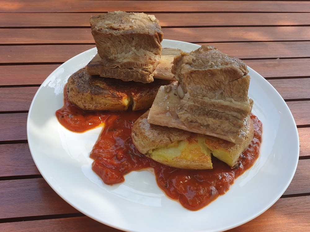 7. Heat up the frying pan sprayed with oil lightly and fry the ribs also 1 minute on each side over medium-high heat. Stack potatoes and ribs over your favourite relish or salsa.