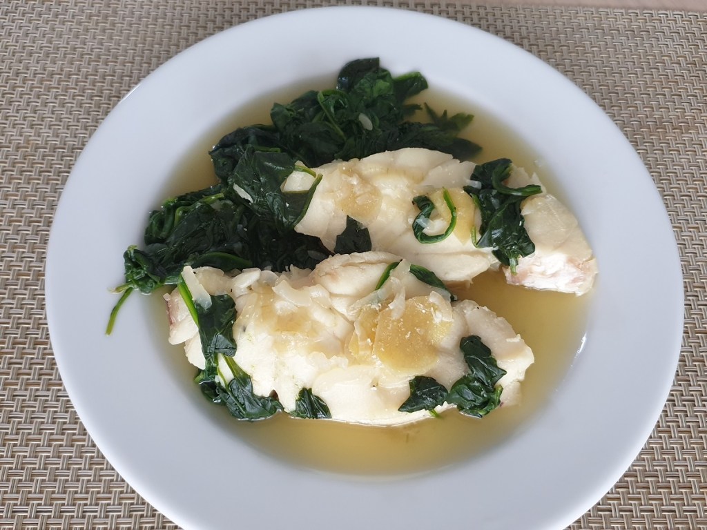 - Turn over the fish and cover each piece with the sliced garlic and a slice of lime. Drop the rest of lime into the stock. Top up the pot with half of the spinach and cover with the lid for one minute. Add the rest of spinach, cover and cook for 5-7 minutes on low-medium heat. Serve the fish with broth in the risotto bowls. A healthy cracker on a side is optional.