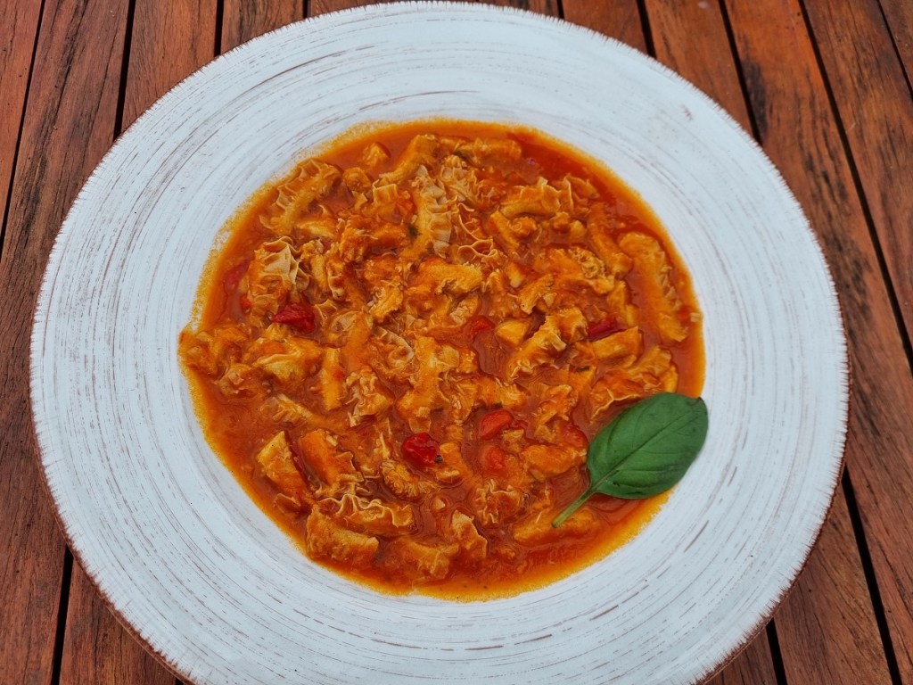 A few years ago, I was lucky to dine in locals’ café in Rome, away from tourist’s streets. That was a place where people stopped by for dinner after work. Only once I tried that Roman Tripe, and finally, I am able to reproduce (almost) that divine taste, texture and flavours.