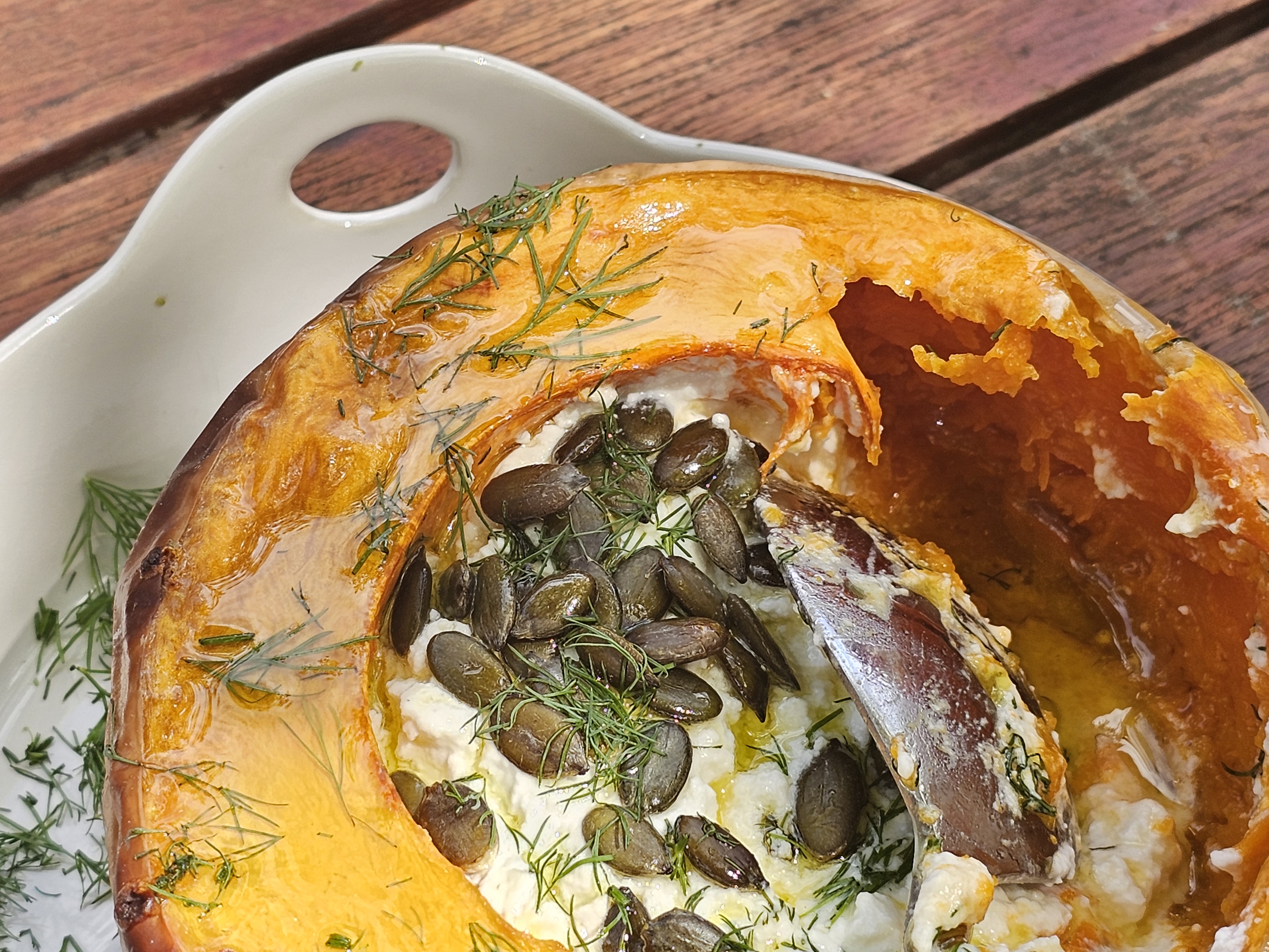 - If the cheese is not moist, combine it with the optional yoghurt. Fill the pumpkin dish with the cheese.